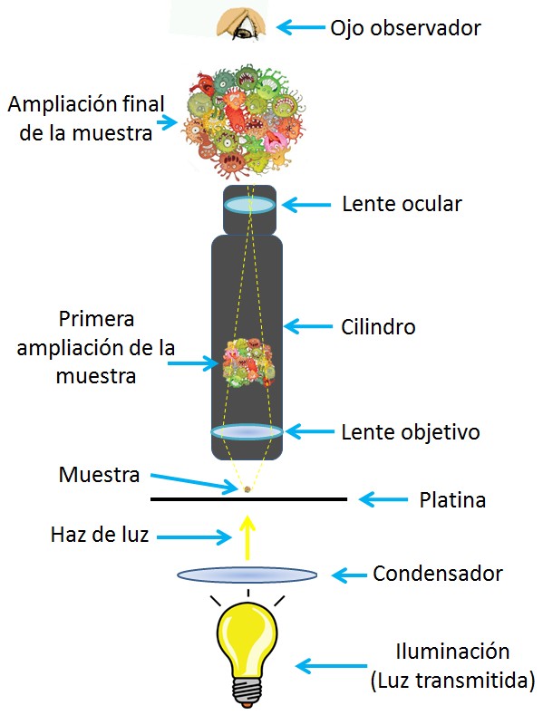 Un microscopio compuesto utiliza un único camino de luz que sigue un recorrido como el que mencionamos antes. Esta luz se divide antes de llegar a los oculares, dependiendo de cuántos tubos oculares tenga el microscopio. Esto significa que las muestras deben ser translúcidas para que la luz pueda pasar a través de ellas, y cada ocular muestra exactamente la misma imagen.