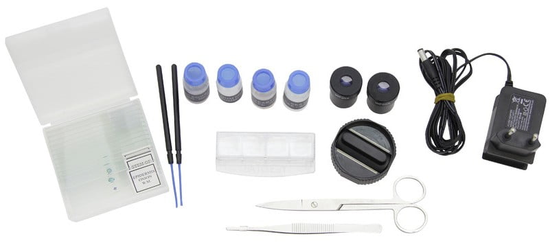 Tiene tres objetivos de 4-10-40 aumentos, diez porta objetos, una herramienta de cortes finos, un lente de Barlow, un bloque de alimentación, así como los primeros elementos de análisis de muestras tal como la levadura, los criaderos y los preparados duraderos.